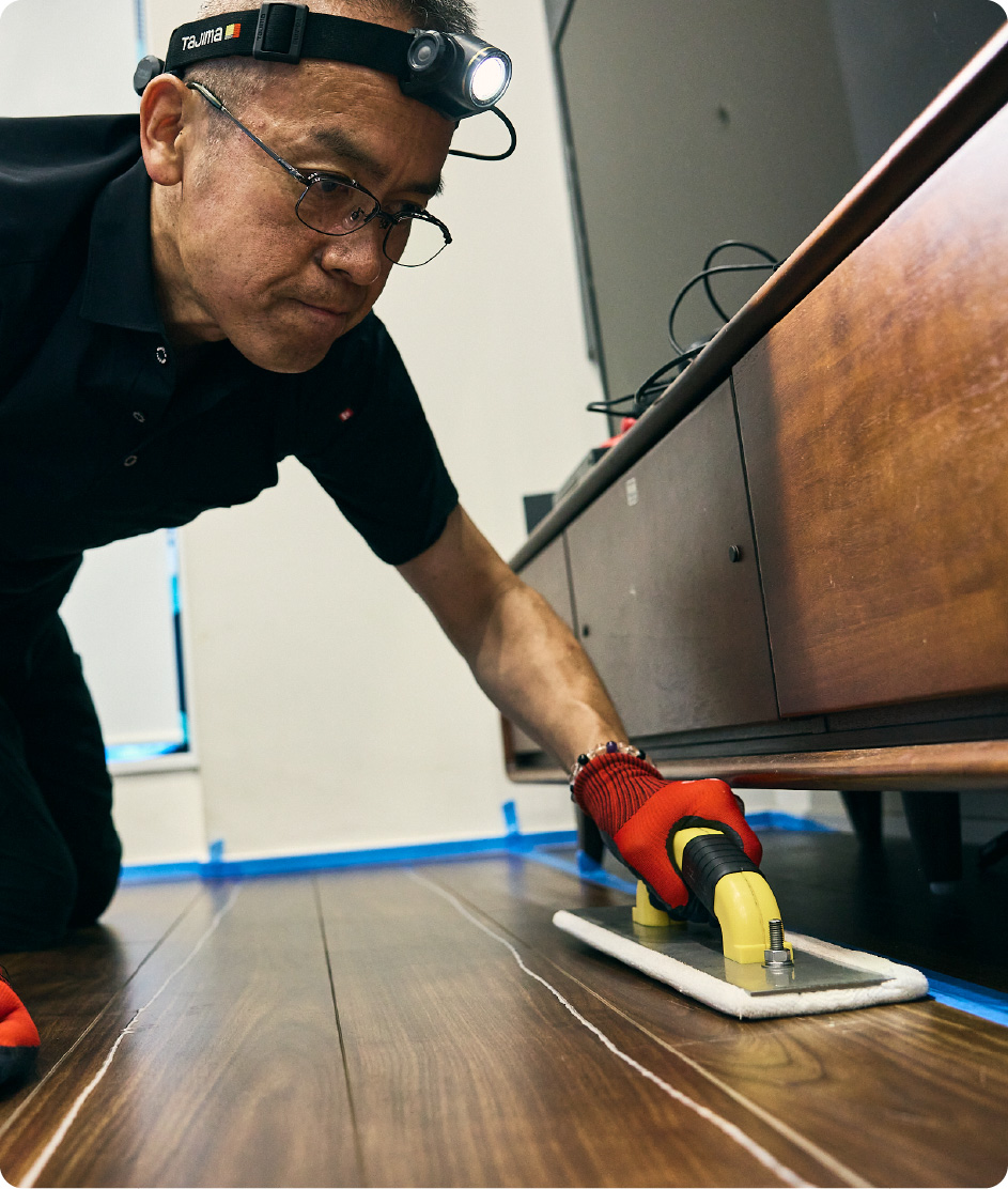 ペットが歩く高さから丁寧に確認しながら進める、専用施工法です。